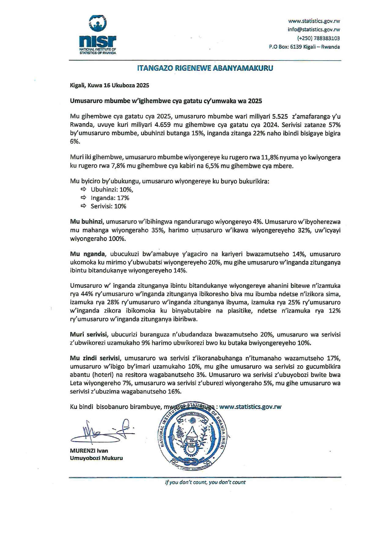 16 December, 2025 Attachment Size UMUSARURO MBUMBE W'IGIHUGU- IGIHEMBWE CYA GATATU 2025 (245.6 KB) 245.6 KB