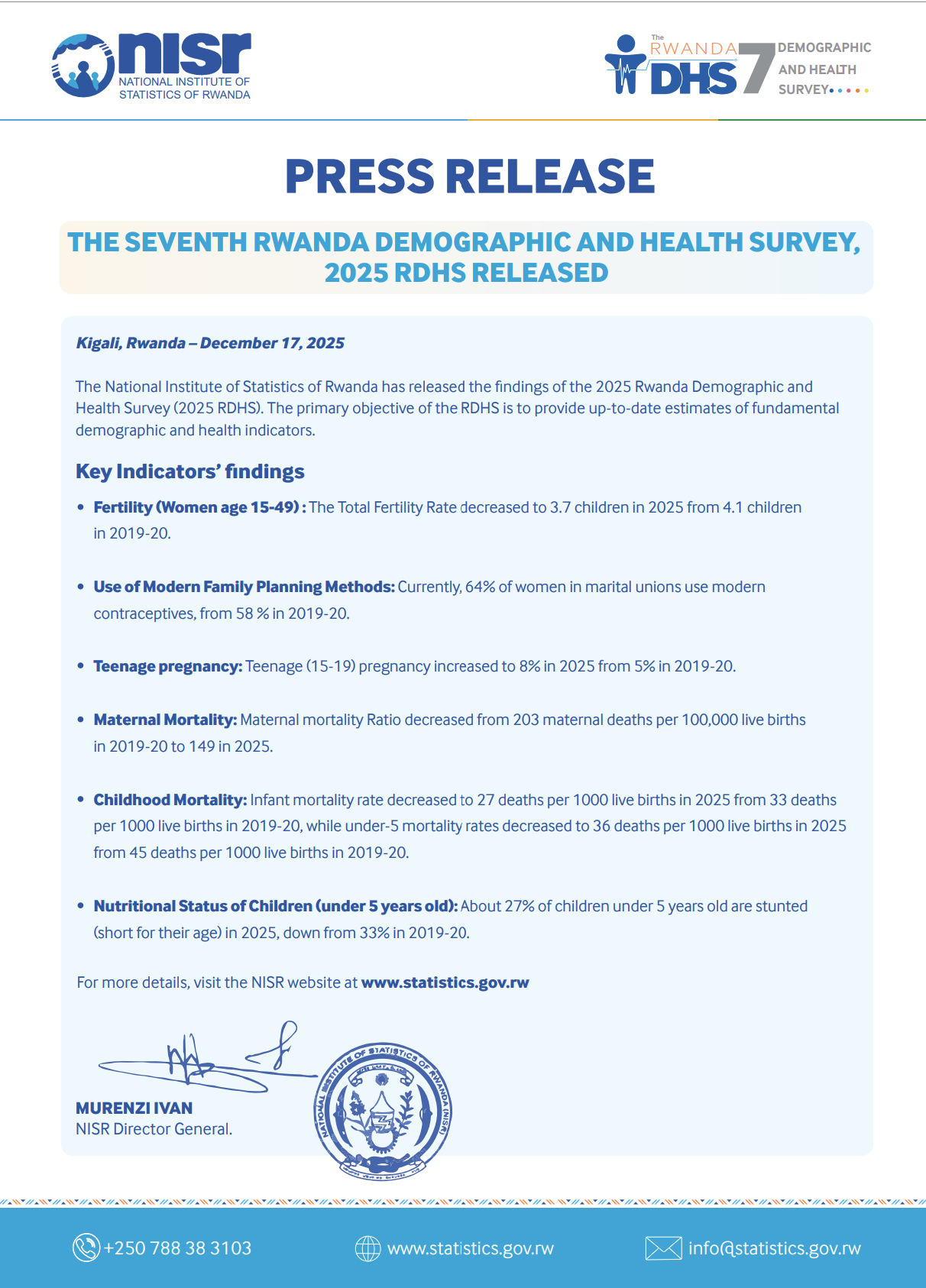 PRESS RELEASE: THE SEVENTH RWANDA DEMOGRAPHIC AND HEALTH SURVEY, 2025 RDHS RELEASED